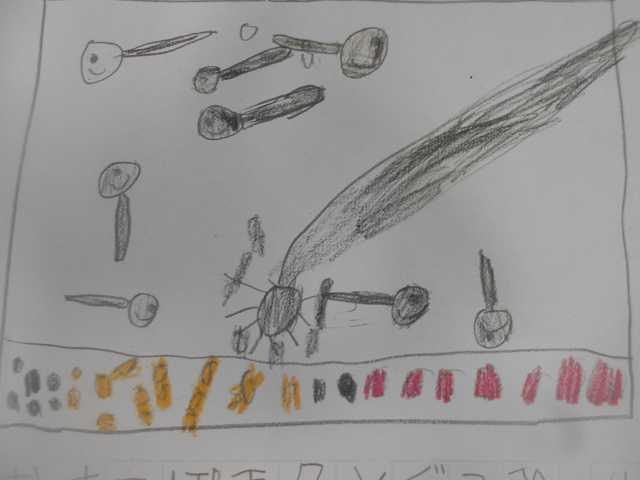 【5月18日】オタマジャクシのしっぽがちょっとさがってきました。カエルみたいになりました。ぼくがガラスの上にのせたけど、ピョンととびました。オタマジャクシがカエルのからをたべました。えさをパクパクたべてうれしかったです。かわいいなと思いました。