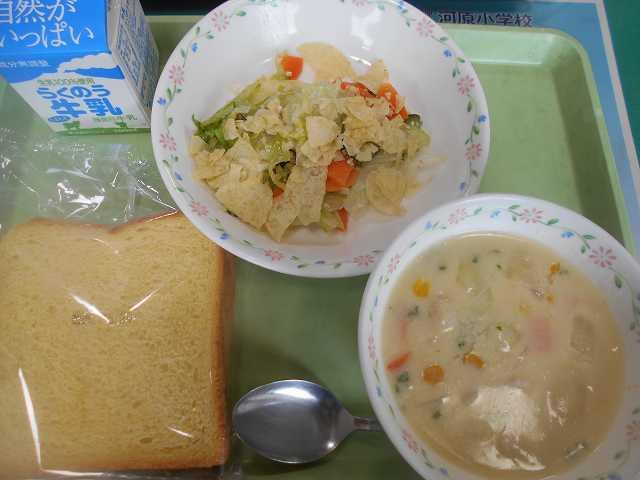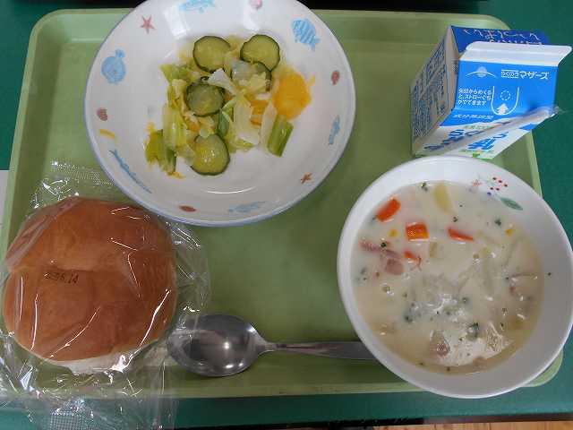 牛乳、かばちゃパン、コーンシチュー、カシュチップサラダです。