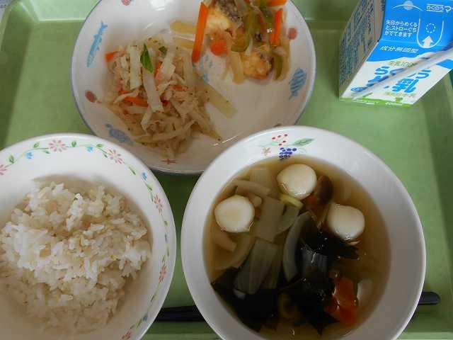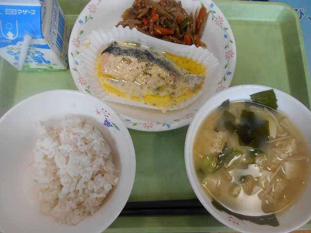 牛乳、麦ご飯、鮭のマヨネーズ蒸し、豆腐の味噌汁、きんぴらゴボウです。