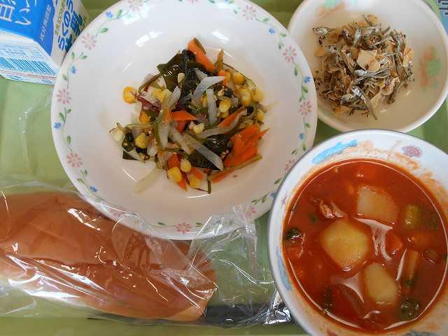 牛乳、まるパン、鶏のタマネギソース、トマトスープ、ごぼうサラダです。