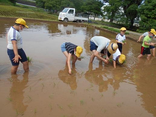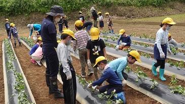昨日は、晴天の日差しのもと1,2時間目に田植え(4~6年生)を、3時間目に芋苗植え(1~3年)を行いました。