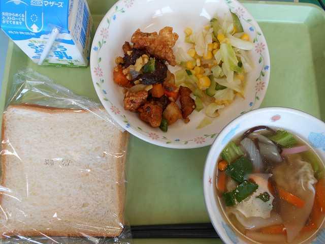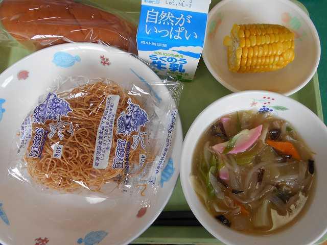 牛乳、ミルクパン、パリパリ焼きそば、とうもろこしです。とうもろこしは西原村議長の山下さんが育てられたとうもろこしです。感謝しておいしくいただきました。