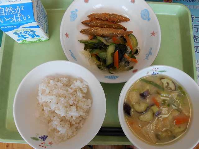 牛乳、麦ご飯、きびなごのごまフライ、糸寒天の酢の物、なすの味噌汁です。きびなごは天草でとれたきびなごです。