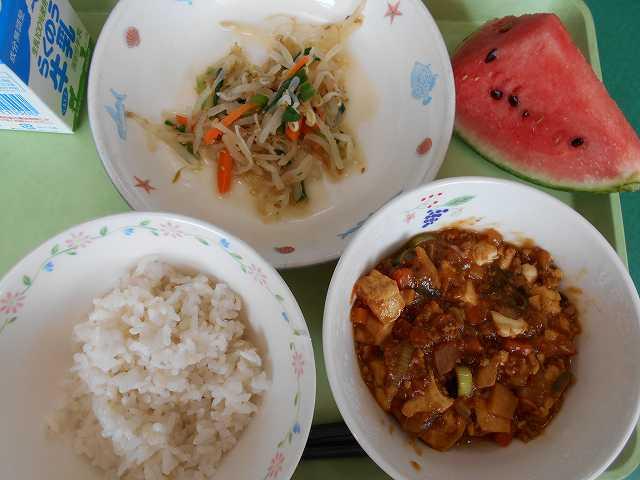 牛乳、麦ご飯、麻婆豆腐、ナムル、すいかです