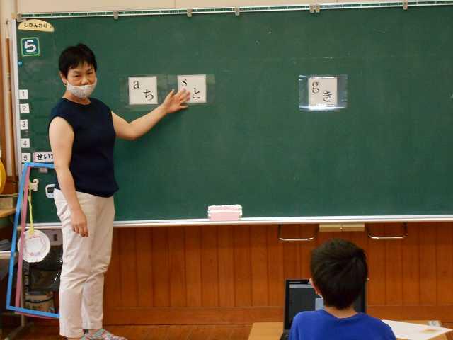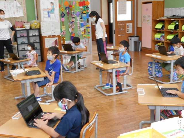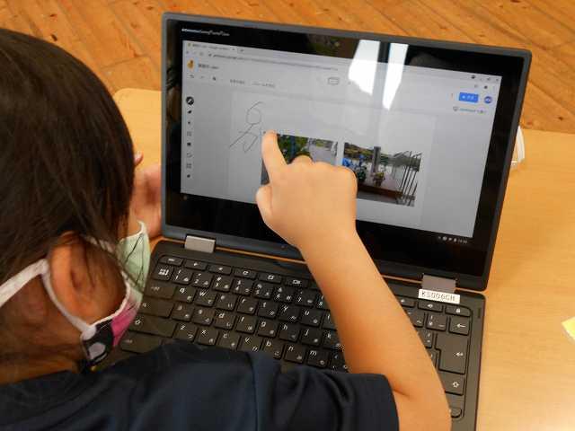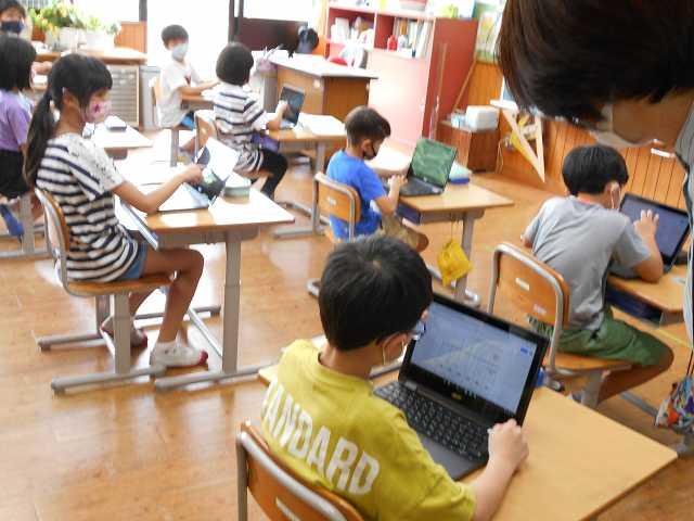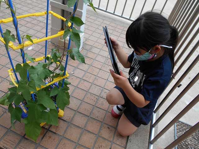 どの学年も1日に何かしらタブレットを使った学習を行っています。最近は1年生もタブレットに挑戦しています。この日は生活科で朝顔の観察をしていました。自分の朝顔を写真に撮り、ファイル名をつけて保存します。ローマ字入力をどうやるのかな?・・・・と思って見ていると、先生が出したカードと同じ文字を見つけて上手に入力していました。ログイン、ログアウトも慣れた物です。