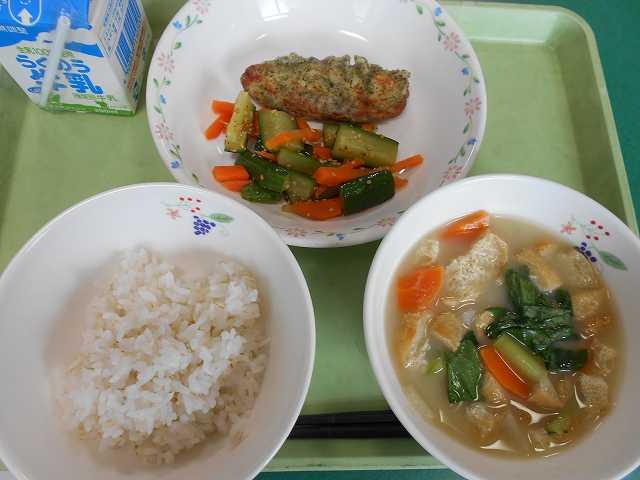 牛乳、麦ご飯、笹かまぼこの青のり揚げ、根菜の味噌汁、かりかりきゅうりです。