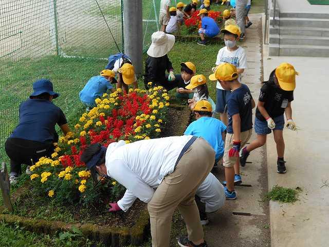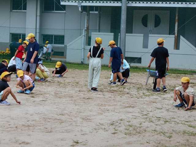 毎週木曜日の掃除の時間は草取りタイムです。運動場の草も随分伸びてきました。今日は曇り空で草取り日和でした。担当の先生の「草をとる!マスクをとる!距離をとる!」の合図で子どもたちしっかり頑張っていました。