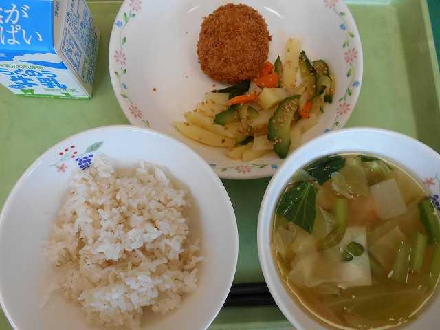 牛乳、麦ご飯、キャベツのメンチカツ、トマトの団子汁、じゃがいものごま酢和えです。