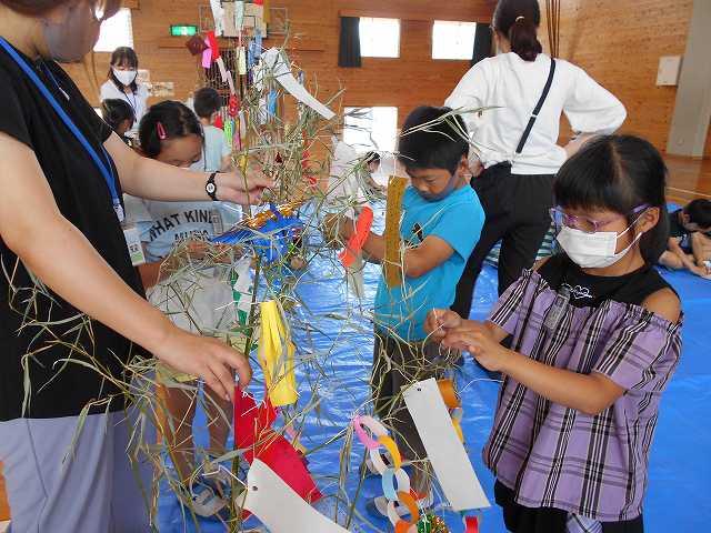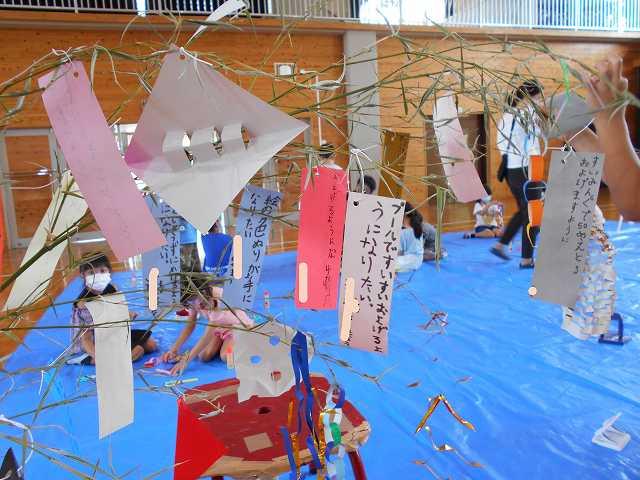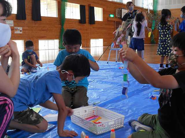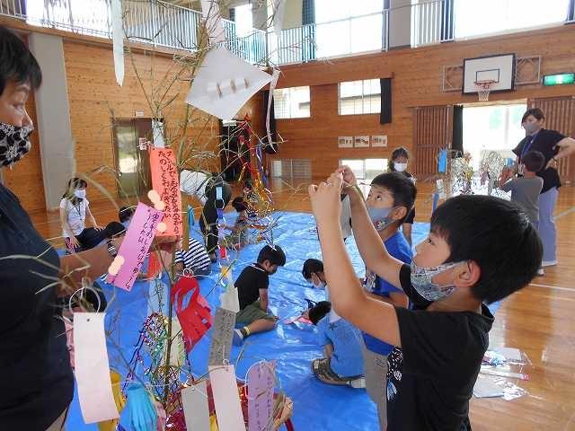 1,2年生が生活科の学習で七夕飾りを作っていました。天の川やちょうちん、輪飾り・・・思い思いに飾りを作り、笹竹に飾り付けました。どんな願い事をかいているのかな・・・と見てみると、「本を読んでかしこくなりたい」「木登りが上手になりたい」「おなかを見て泳げるようになりたい」等々・・・・なんとも子どもらしいかわいいお願いごとがたくさんありました。七夕の日は晴れるといいですね。