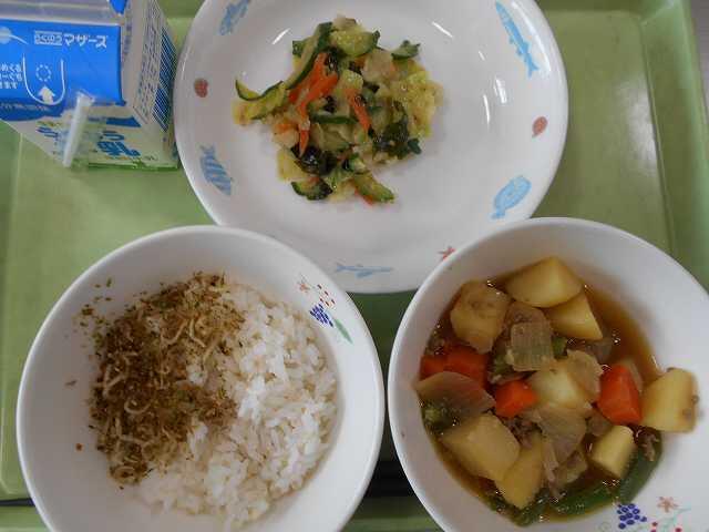 「新じゃがのそぼろ煮、酢みそ和え、手作りふりかけ」です。