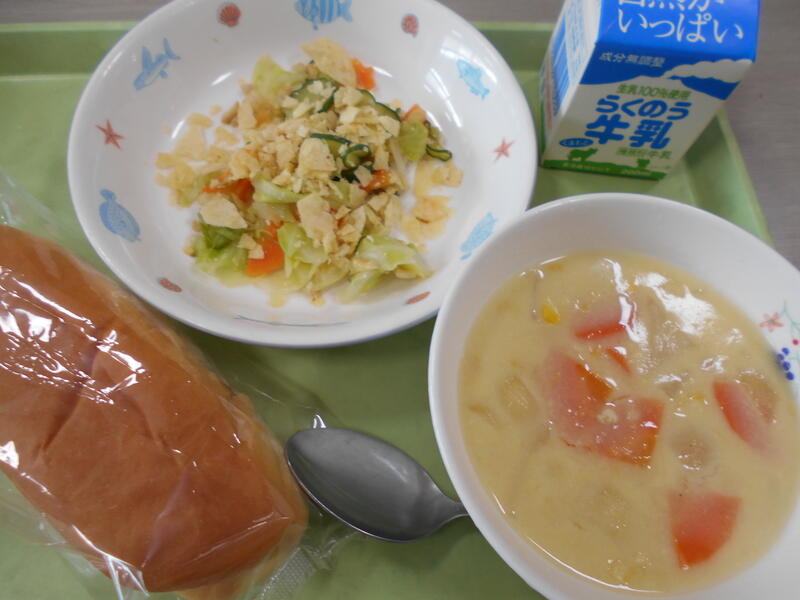 コーンシチュー、カシュチップサラダ、コッペパンです。