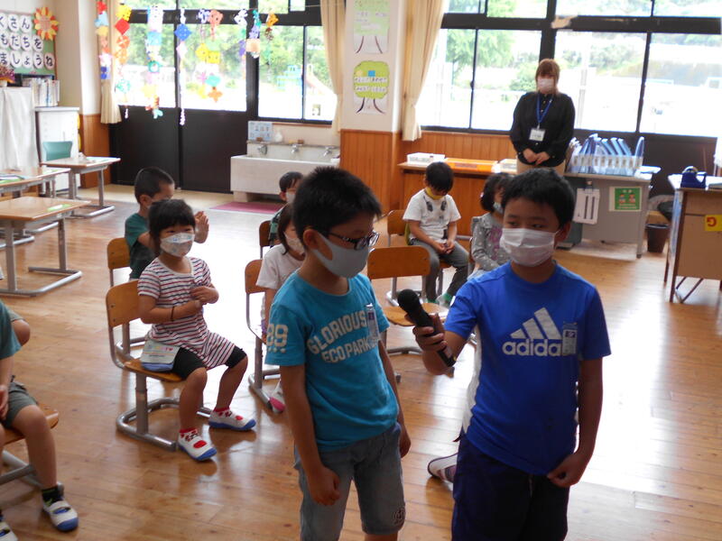 1年生へのインタビュー。名前や好きな遊び、食べ物など、元気に答えていました。6年生は、手品やクイズで皆を楽しませました。