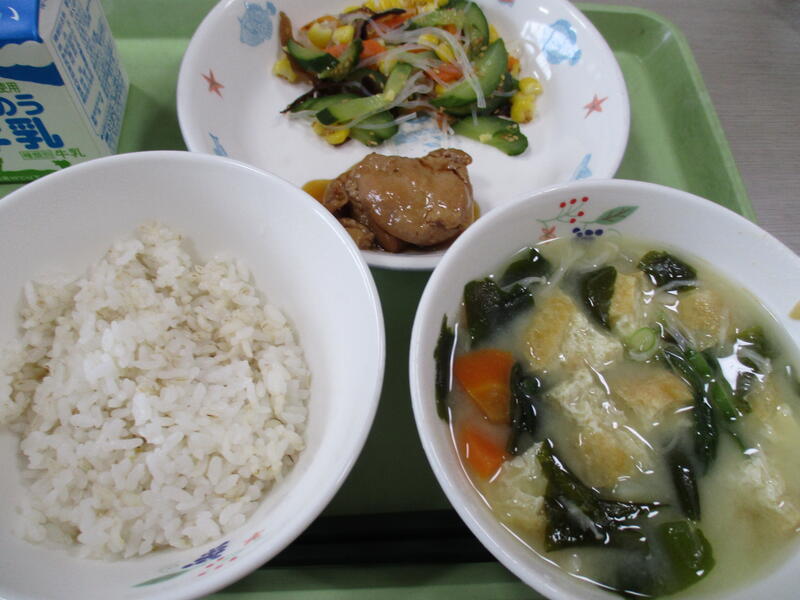 麦ご飯、じゃがいもの味噌汁、とりの照り焼き、春雨の酢の物です。暑い日にはさっぱりした酢の物はとても食べやすいですね。