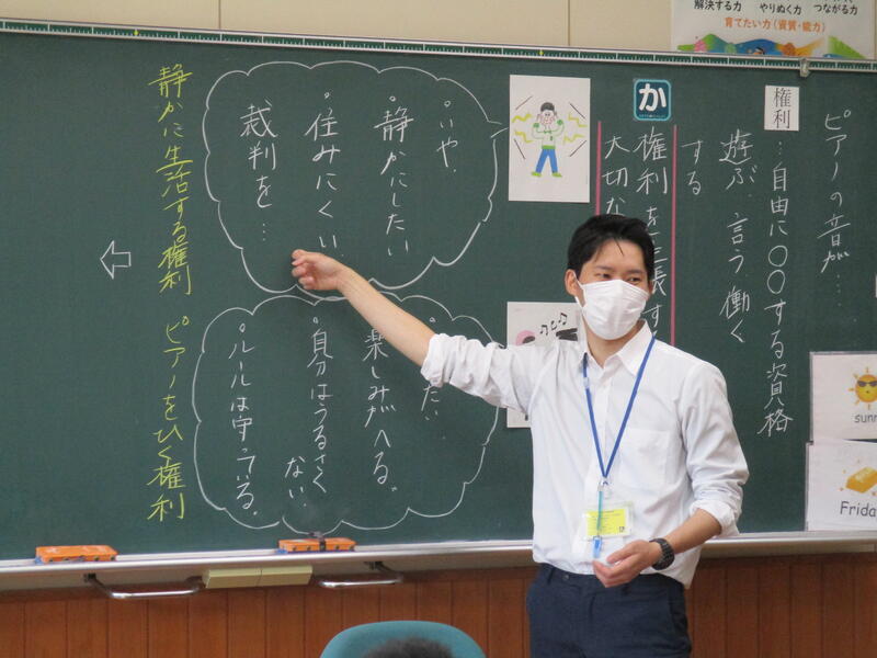 6年生、教育委員会から指導主事の先生にきていただき、道徳の授業を参観していただきました。権利について考えました。