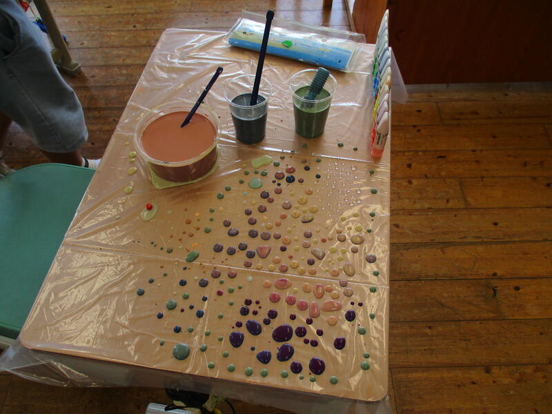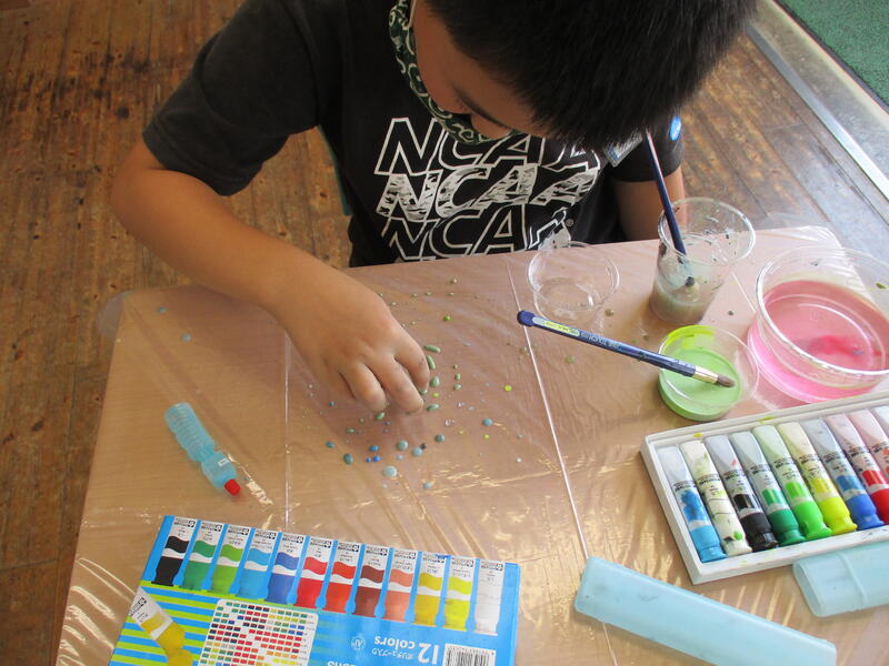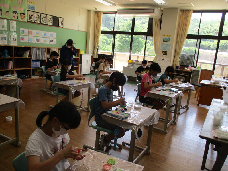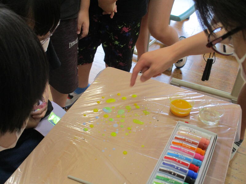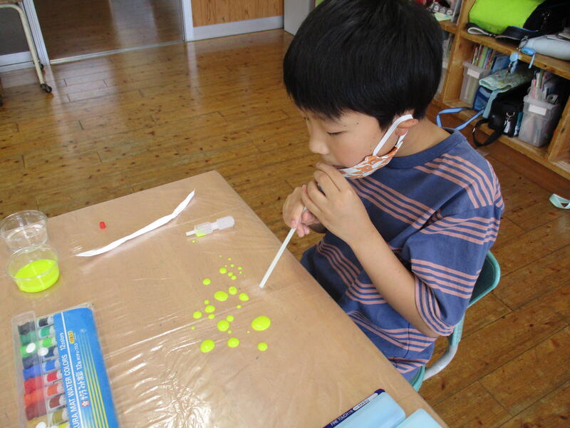 5年生、図工。色水、カップ、ストロー等を使って水の美しさを見つけていました。