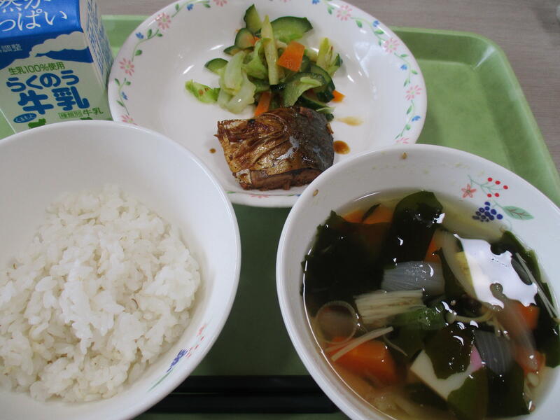 麦ご飯、味噌けんちん汁、さばの生姜煮、切り干し大根のごま和えです。