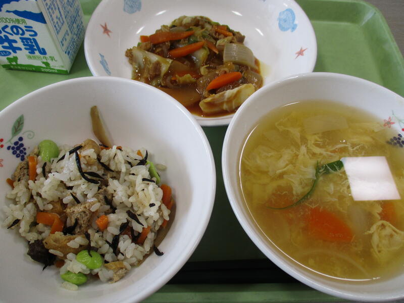 ひじき五目ご飯、豚肉の味噌炒め、かき玉汁です。ひじきは食物繊維、鉄分が豊富で貧血予防、美肌効果もあるそうですよ。