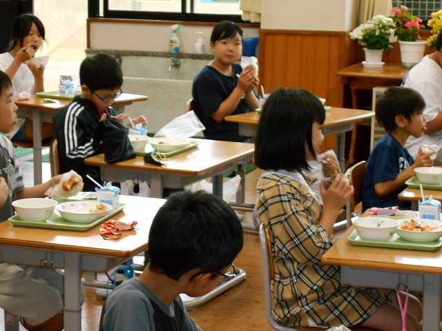 6年生と3年生です。前を向いて黙食も当たり前の光景になりました。