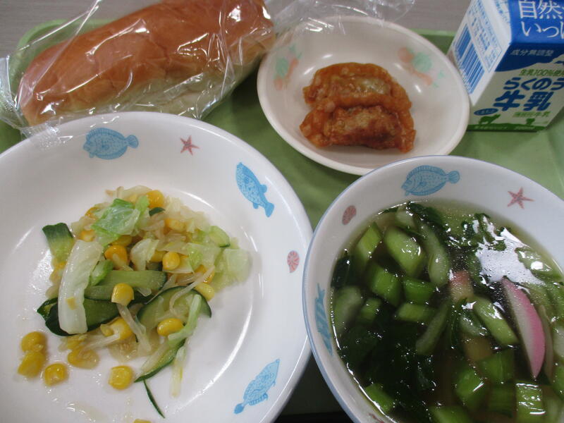 ミルクパン、揚げ餃子、中華サラダ、ワンタンスープです。
