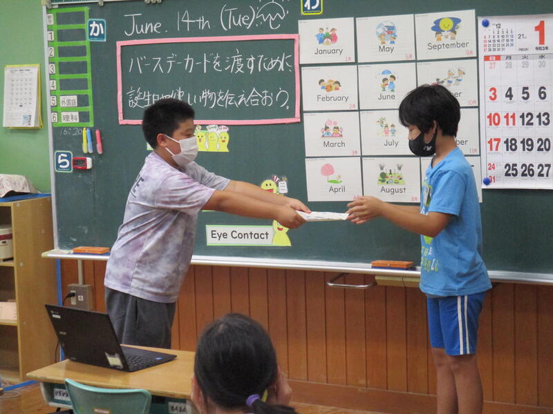 5年生の外国語の公開授業を行いました。小中の円滑な接続や先生方の授業力の向上を図ることを目的として、本年度より西原村の3校で、外国語、英語の授業公開を行っています。「友だちにバースデーカードを贈るために、誕生日や欲しいものを尋ねたり、答えたりしよう!」という単元のゴールに向かって学習をしました。発話する必然性と自己決定のある活動を仕組んでいます。