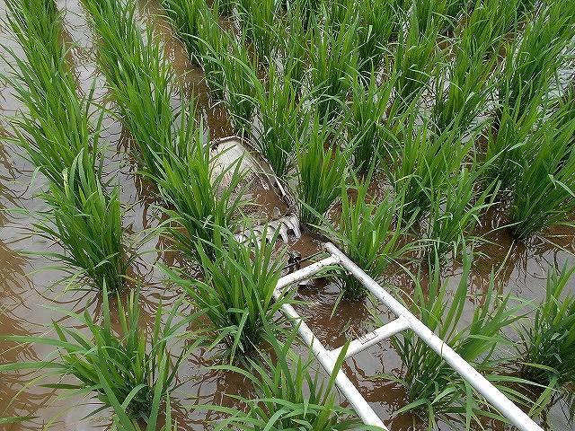 6月4日に田植えをした稲がすくすく育っています。同時に草も生えてきました。本日、7月10日(金)、5年生が堀田 様の指導の下、中耕除草機を使って田の草取りをしました。中耕除草は除草以外に土を拡販することで根に酸素が送られることや土中の有毒ガスが抜けるという効果があるそうです。