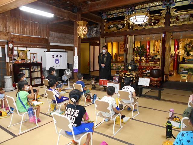 慈雲寺、本堂でお話を聞き、見学させていただきました。天井にある100枚以上の絵や、たくさんの仏具に興味津々でした。