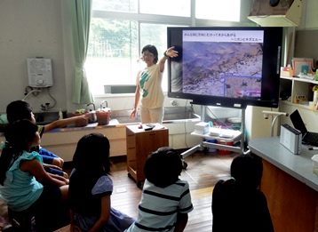 前半は、スクリーンを見ながら、カエルを始めとした水辺の生き物のお話を聞きました。「知ってる、見たことある、どんなところにいる、名前も知っている」などの予想以上の子どもたちの元気な声に、坂本さんもびっくり!!さすが、河原っ子です。