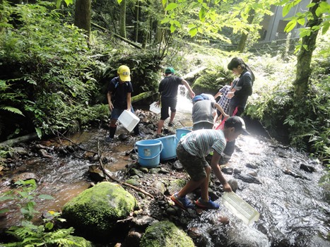 午前中は、大きく3つのグループに分かれて、滝川、木山川、布田川にそれぞれ行って、川の中に入って川の中の生き物を採集しました。