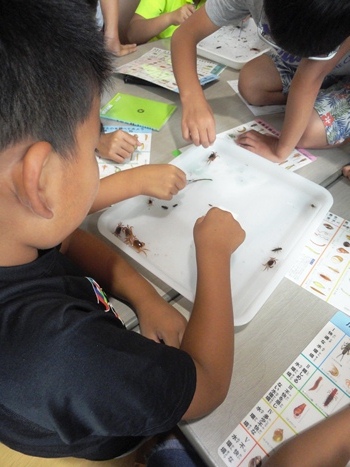 おなかいっぱいになった後、河原小で、午前中に集めてきた生き物を「指標生物」として、川の水の水質を調べていきました。