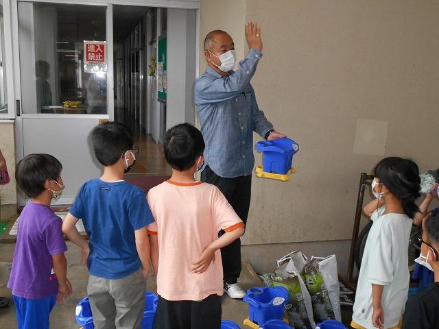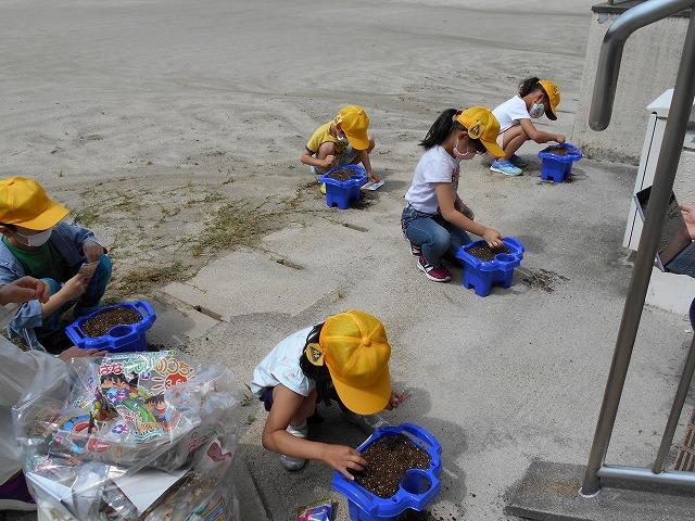1年生 ソーシャルディスタンスをとりながら朝顔の種まきをしました。「早くおおきくな~れ」と種に話しかけながら上手に種まきしていました。