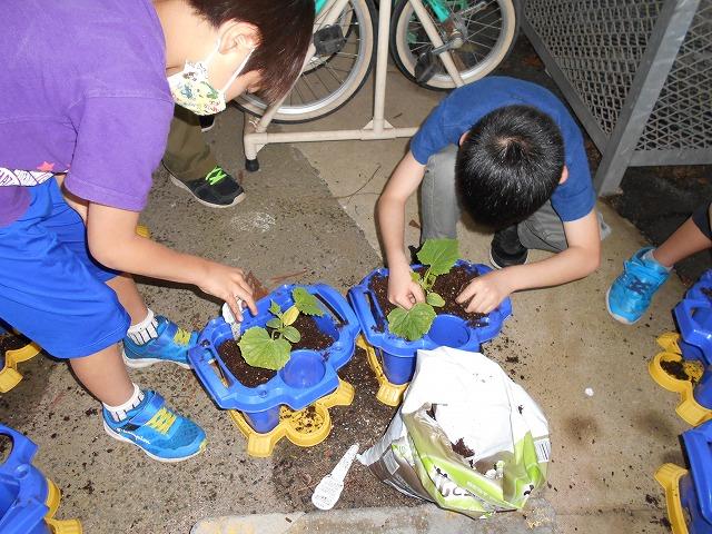 2年生 ピーマン、キュウリ、トマト、スイカの苗を植えました。来週まで、先生たちで水やり等のお世話をします。大きくなっているか、楽しみですね。