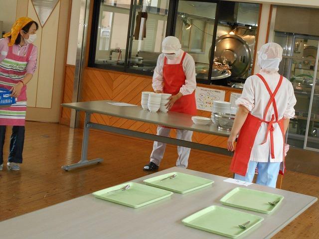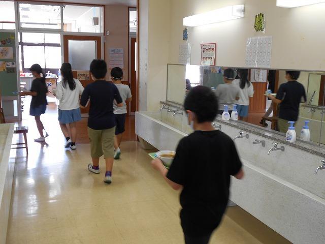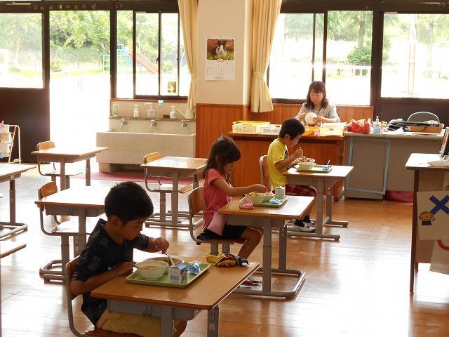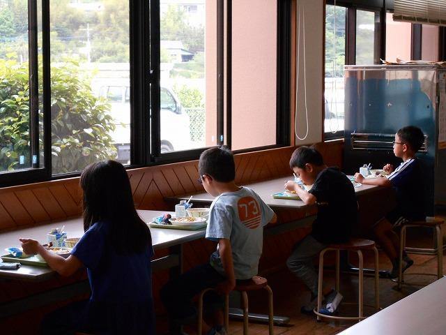 1ヶ月ぶりの給食をおいしくいただきました。間隔をあけて、だまって行儀よく食べていました。