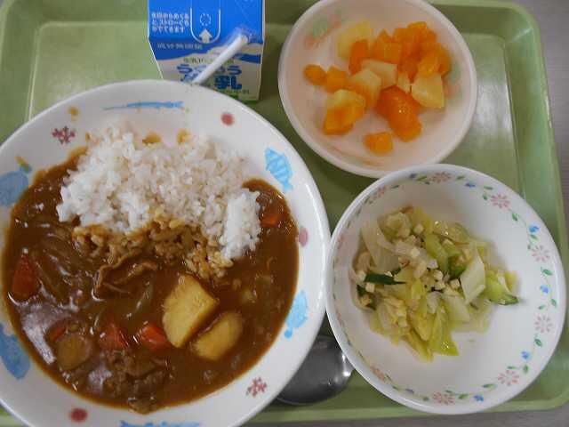 「ポークカレー、グリーンサラダ、フルーツミックス」子どもたちの大好きなメニューで食欲もりもりでした。