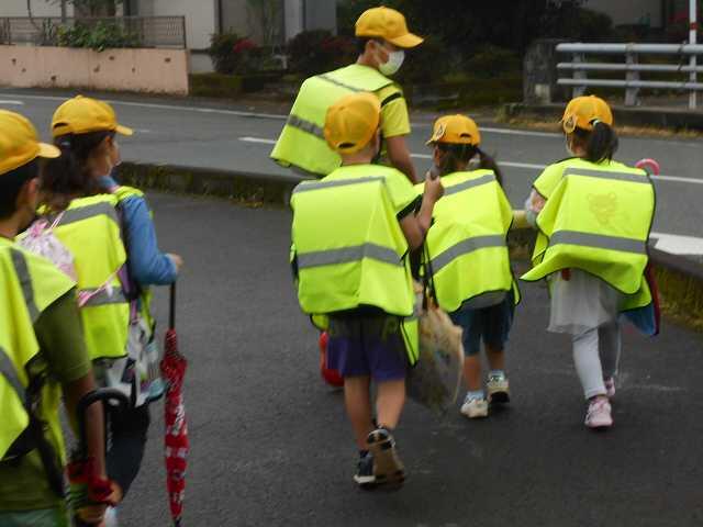 ランドセルを背負って、「てくてく」歩いて登校しました。長い距離を歩くのは大変そうですが、元気に登校できました。上級生はしっかり見守りながら連れてきてくれます。「おはようございます」のあいさつも上手でしたよ。