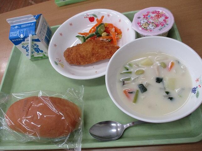 豆とエリンギのシチュー、人参サラダ、魚のフライ、パン、牛乳でした。