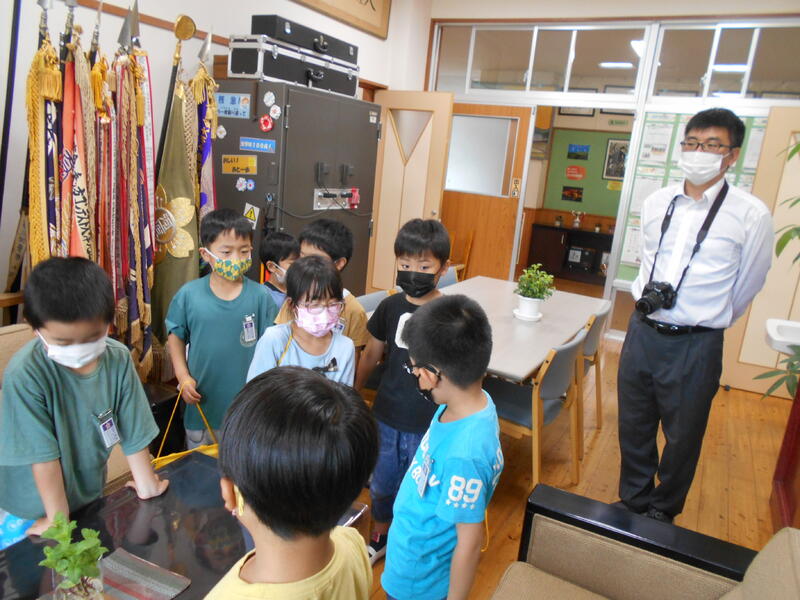 1,2年生が生活科の学習で学校探検をしました。二班に分かれ、2年生がリードして1年生を案内していました。校長室や職員室は教室にはないものがたくさんあり珍しそうでした。校長室では、トロフィーや優勝旗、職員室では大きなカレンダーや沢山の鍵について興味津々でした。
