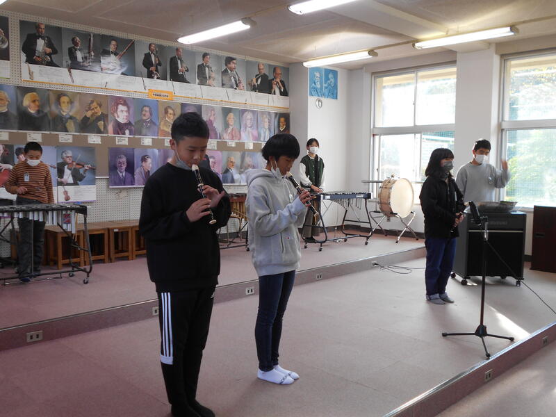 今月は6年生企画の音楽集会でした。1年生から5年生までに学習する曲のメロディーをリコーダーや鍵盤ハーモニカで演奏し、その曲の題名を当ててもらうというクイズ形式での発表でした。音楽室からリモートで「日の丸」「こぎつね」「小さな約束」「茶色の小びん」等の曲を配信しました。最後は「ラバースコンチェルト」を1番、2番で楽器を変えて合奏しました。バスマスターが入るとぐっと曲がしまりました。
