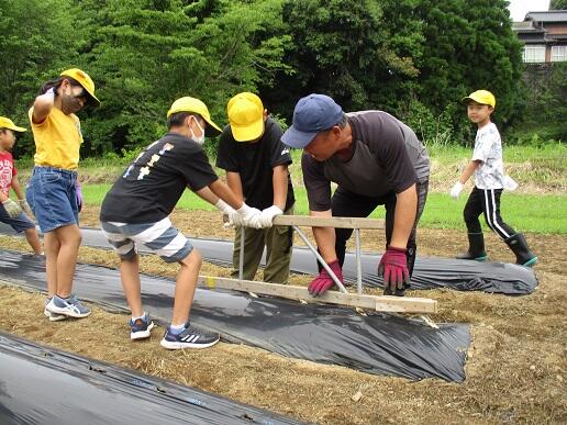 本日は、梅雨の晴れ間に、芋苗植え体験を行いました。
