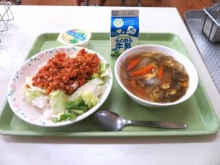 本日7月8日は語呂合わせで「なはの日」だそうです。ということで沖縄県那覇市にまつわる料理「タコライス、もずくスープ、シークワーサーゼリー、牛乳」が給食に出ました。