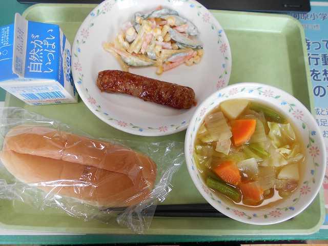 牛乳、セルフドッグ、野菜のスープ煮、スパゲティサラダ。セルフドッグは子どもたちの大好物。1年生も上手にはさんで美味しそうに食べていました。