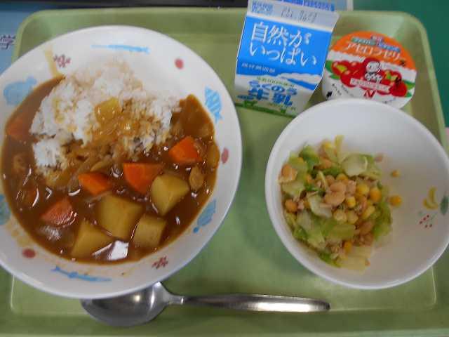 牛乳、チキンカレー、ビーンズツナサラダ、アセロラゼリーでした。