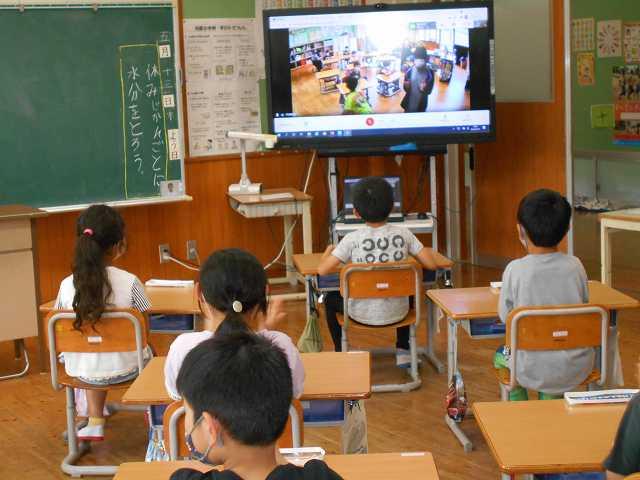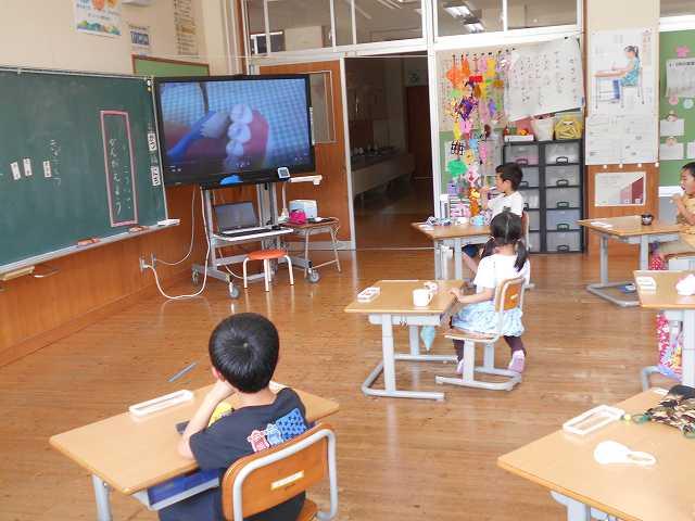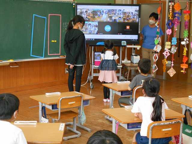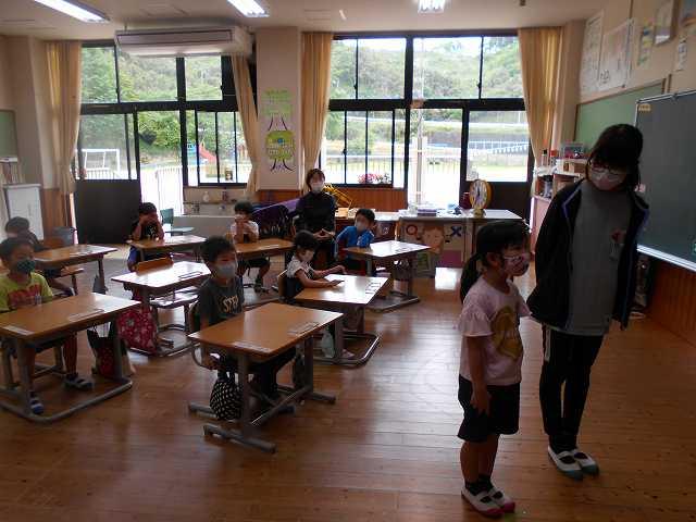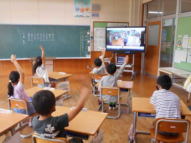 1年生教室から、インタビュー形式での自己紹介。名前、好きな食べ物など、上手に言えました。