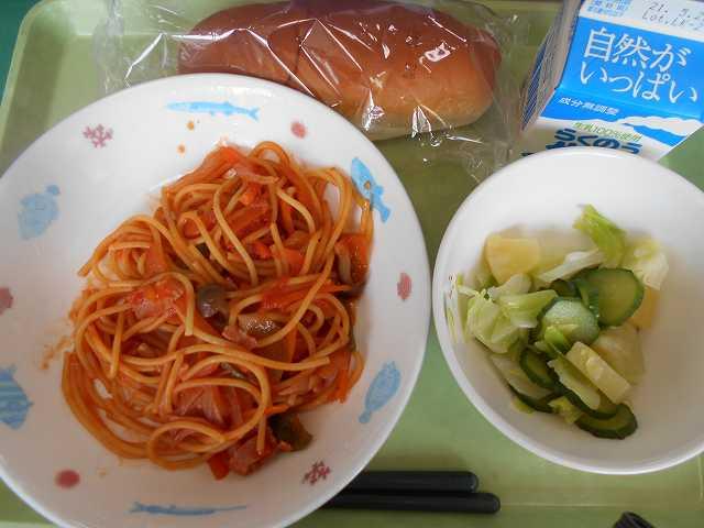 ミルクパン、牛乳、スパゲティナポリタン、キャベツとパインのサラダ