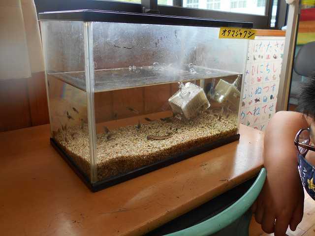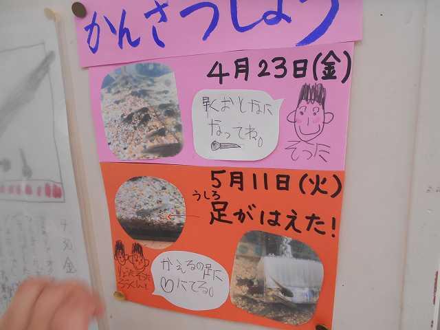 ひまわり1組ではオタマジャクシを飼っています。毎日しっかり観察して観察日記も書いています。今日は足が生えてカエルらしい顔つきになっているオタマジャクシを発見!子どもたちが教えてくれました。