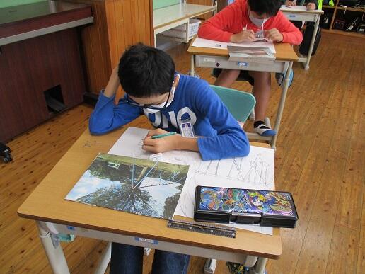6年生の図工では「思い出の校舎」の題材で学校の風景を書いていました。