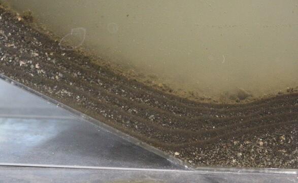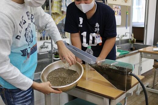 といに礫砂泥を混ぜた土を置き,水で流すことを、時間をあけて数回くり返しました。