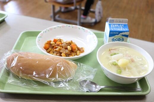 今日の給食は,コッペパン・チリコンカン・大根とベーコンのクリーム煮・牛乳でした。