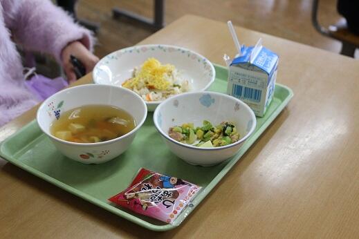 3/3の給食は,五目ちらしずし・すまし汁・菜の花和え・ひなあられ・牛乳でした。