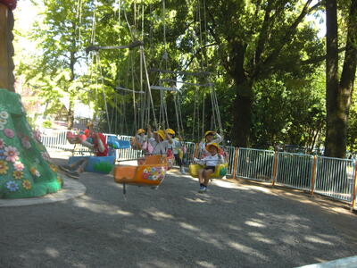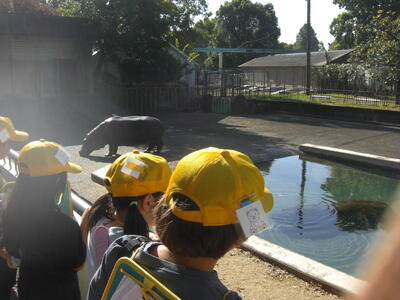 1・2年生の動植物園の「うらがわツアー」では、普段入ることのできない檻の裏側や動物の医療施設を見ることができ、子どもたちは目をキラキラさせながら見学を楽しんでいました。乗り物体験では、自分の乗りたい物に乗り、満足気の子どもたちでした。