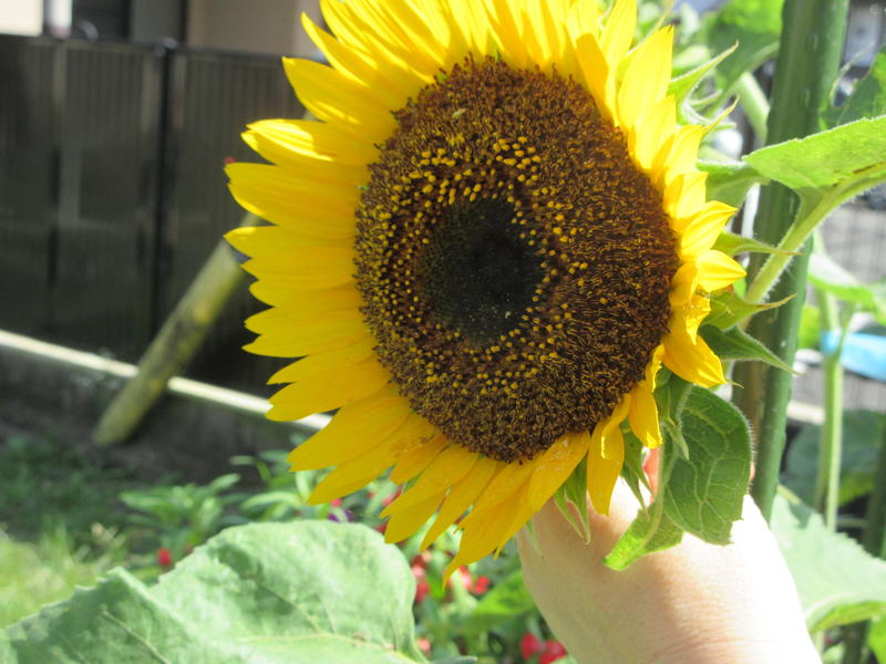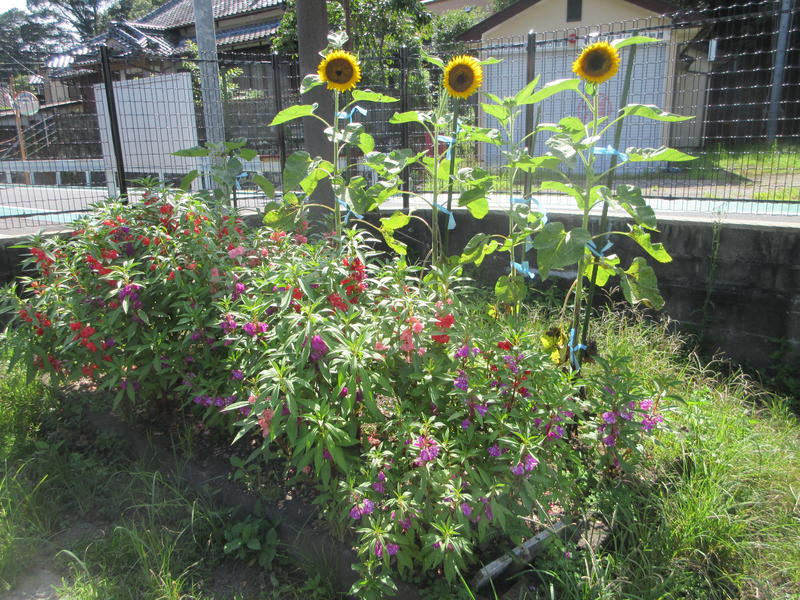 休校中に種をまいたホウセンカとヒマワリが満開です